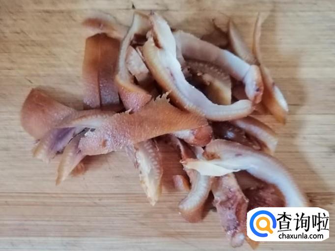 取出熟猪蹄筋,用刀把猪蹄筋肉多的部分剔下来,然后把剔下来的蹄筋肉,放在菜板上,用刀切好待用。