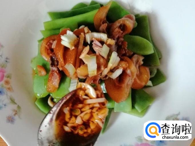 在绿芸豆盘中,加入切好的猪蹄筋肉,然后撒上适量葱花,也可以根据自己的口味,加入香菜等。