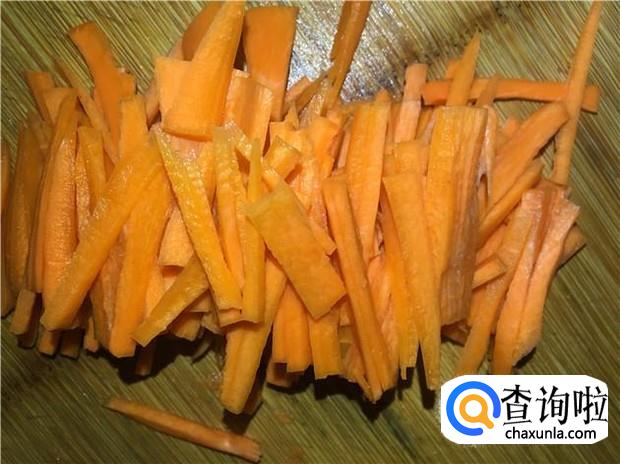 胡萝卜削皮,切掉两头,然后再切成丝状,备用。