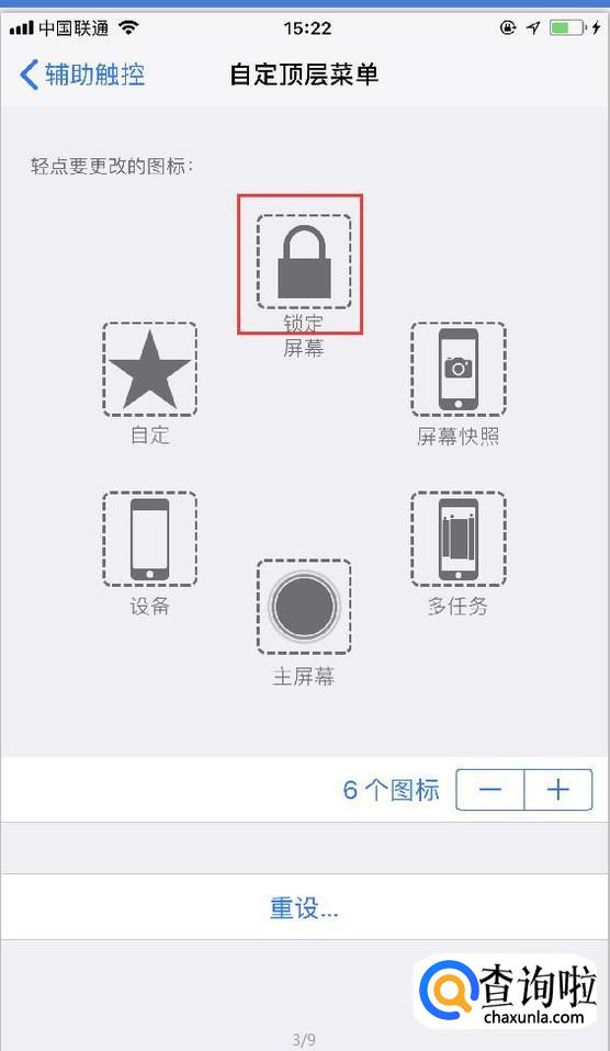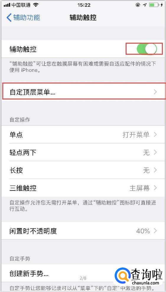 点击进去之后我们将辅助触控功能打开,就可以看到相关的设置选项了。点击自定义顶层菜单可以对小圆点中的内容进行自定义。