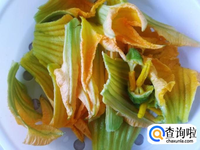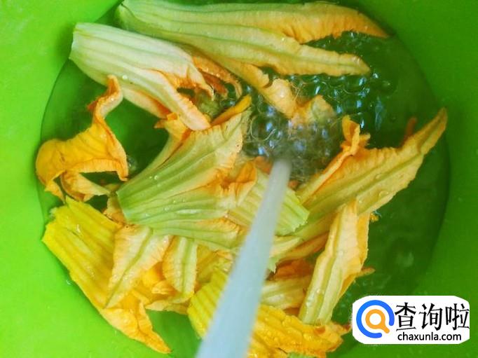 首先把南瓜花梗和花耳片去掉,然后把清理好的南瓜花放到水里清洗干净。