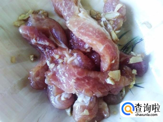 瘦肉切成丝,加适量的盐、姜蓉、生抽、料酒腌制几分钟。