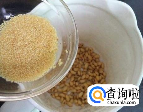 第二天早上,将黄豆洗一遍,放进豆浆机中,再放入少许小米,放小米可以使豆浆更浓、更香。
