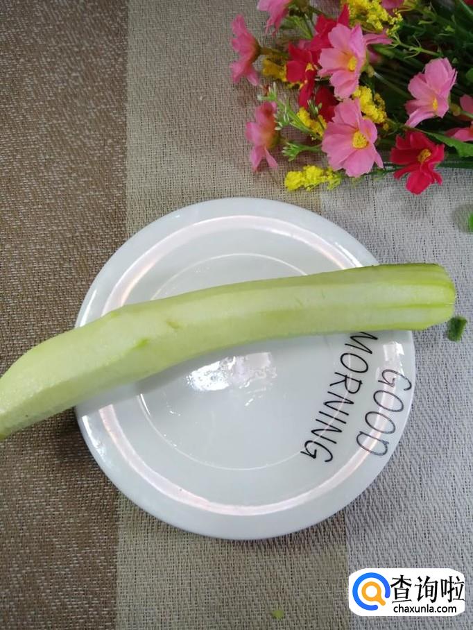 准备一根丝瓜,洗净去皮后,切成滚刀块,放入盘中备用。注意,丝瓜一定要选用比较鲜嫩的丝瓜,老的丝瓜瓤会嚼不动。