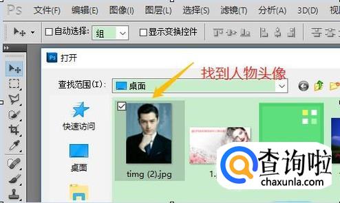首先在PS软件里,我们点击"文件"-"打开",然后在电脑桌面或者其他地方找到我们需要添加的人物头像素材,如下图所示