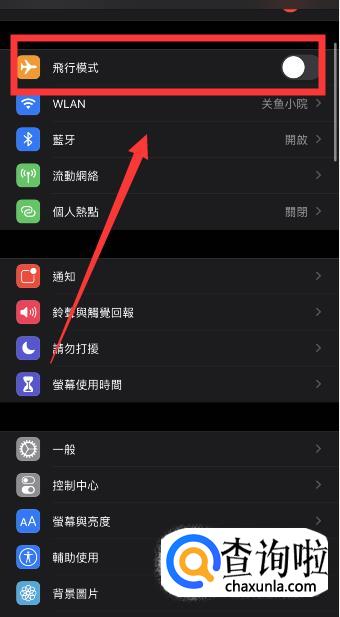 如果不行,点击【设置】,再点击【飞行模式】,打开飞行模式,然后再关闭飞行模式,让手机自动搜索一下信号进行尝试。