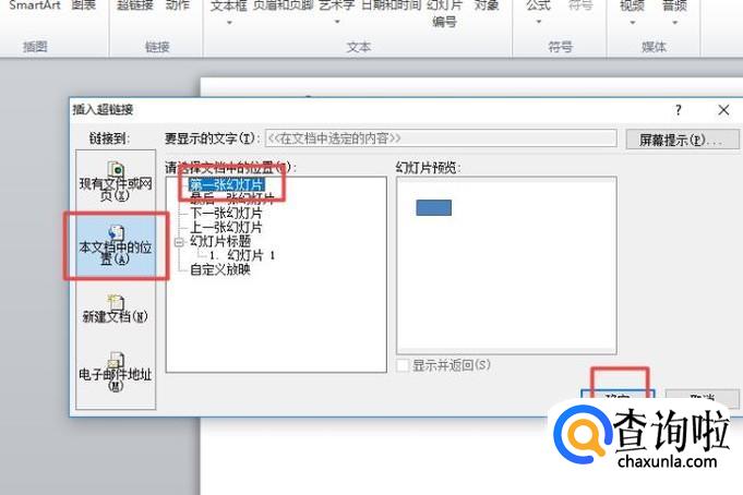 弹出的界面,我们点击本文档中的位置,之后点击第一张幻灯片,然后我们点击确定就可以了,这样就设置好超链接了。