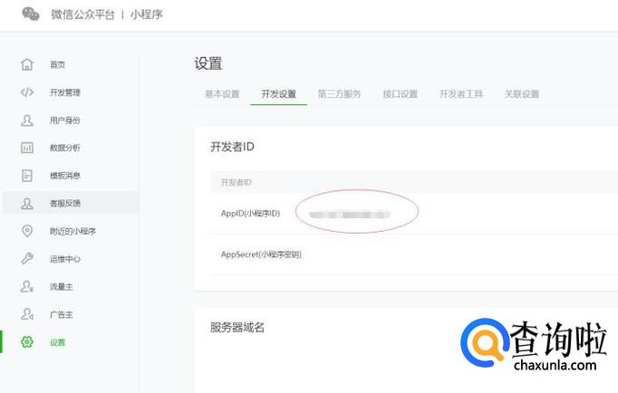 在左侧的导航中找到设置,找到开发设置,这里就可以看到自己的appid了