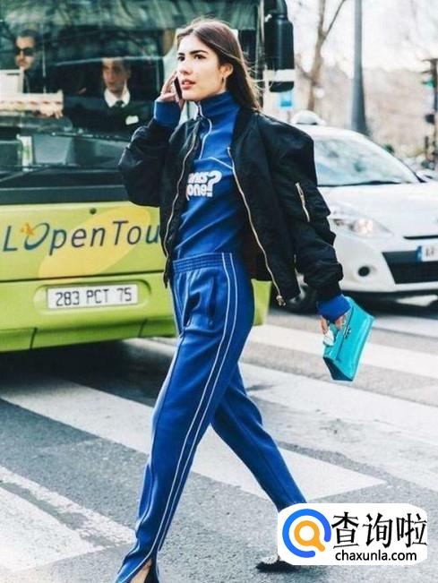 一袭蓝色的运动套装搭配一件黑色的小外套,然后随手拿上一个包,是不是觉得运动风也可以让人感觉这么帅气呢?