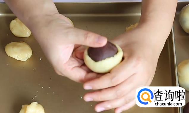 把蛋黄包进莲蓉馅里,滚圆放在一旁备用。这个时候需要注意手法,需要轻轻的把蛋黄放进莲蓉馅里面。在这里也可以制作多种自己喜欢的馅。