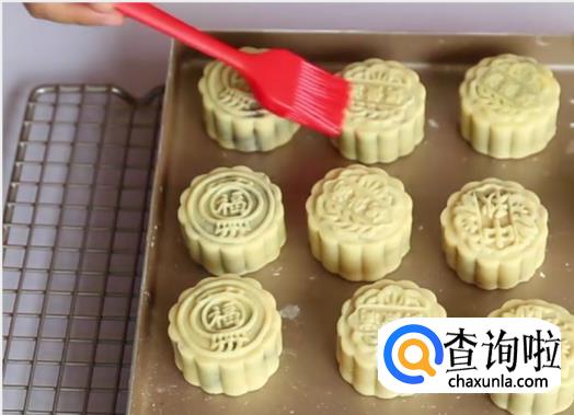 5分钟后,把月饼从烤箱里面取出,表面刷一层薄薄的蛋液。一定要用小刷子刷,这样才会均匀。刷蛋液一定要薄薄的一层,只刷突出来的图案即可,如果蛋液太厚,会影响成品外观。