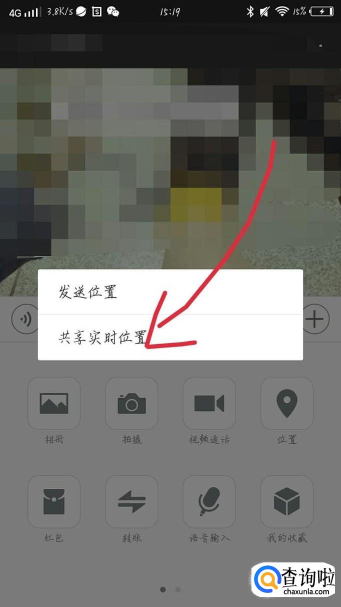 你会看到进入一个新的界面,点击“共享实时位置”选项,如图1箭头所示。好友接受之后,你就可以知道他的位置了。