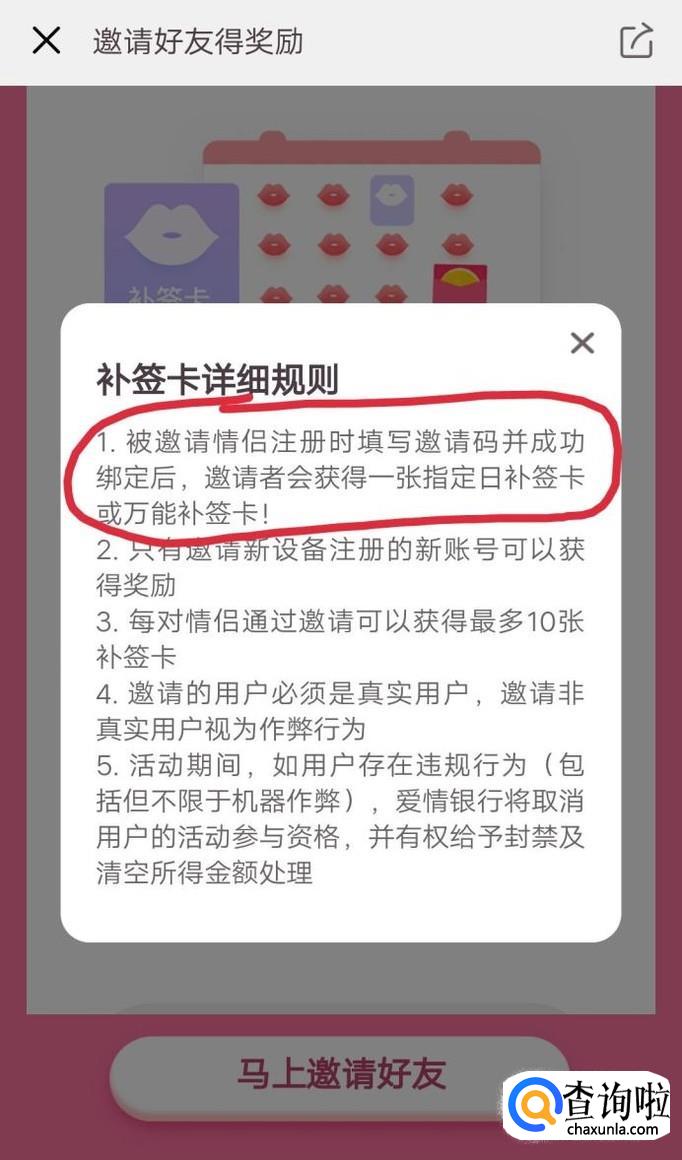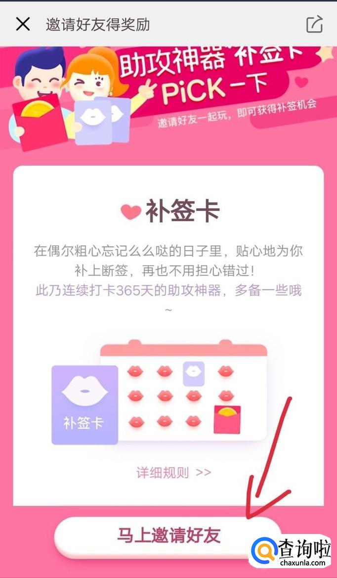 邀请好友成功后就可以过的一张么么哒万能补签卡或指定日么么哒补签卡!