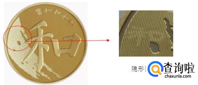 找隐形图文。和字纪念币飞白的左上角有一个“和”字型的隐形图文,我们只需要倾斜适当的角度就能发现它。这种图文很难被模仿,因此假的纪念币都没有这样的图文。