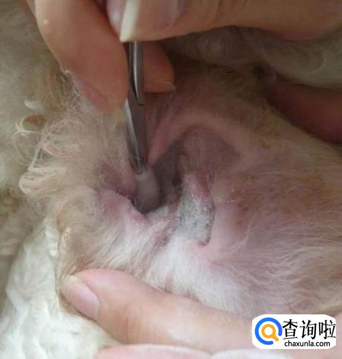 首先我们先使用镊子夹着棉花在狗狗耳朵化脓的地方轻轻擦拭,我们需要擦掉大部分的血水、脓水等。