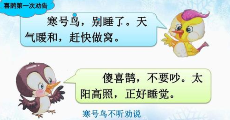 晚上又来临了,寒号鸟又重复着昨天晚上一样的故事。就这样重复了几个晚上,大雪突然降临,鸟儿们奇怪寒号鸟怎么不发出叫声了呢,太阳一出来,大家寻找一看,寒号鸟早已被冻死了。