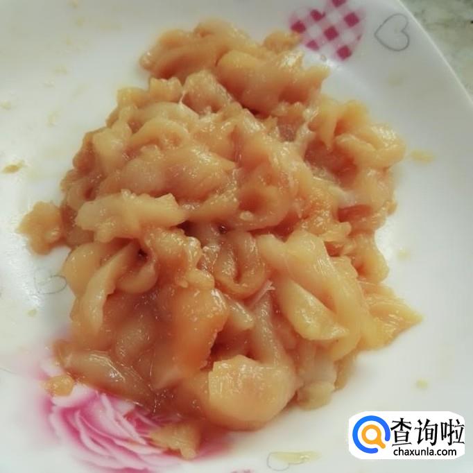 先把鸡胸肉洗干净控水后,再切成丝,放生粉,蚝油,鸡粉,盐搅拌均匀腌十分钟。