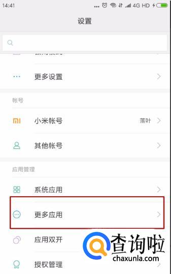 找到设置并点击进入设置界面,进入设置界面后我们可以对手机的各项参数进行调整,我们向下拉动,可以看到应用管理里的“更多应用”,我们点击进入。