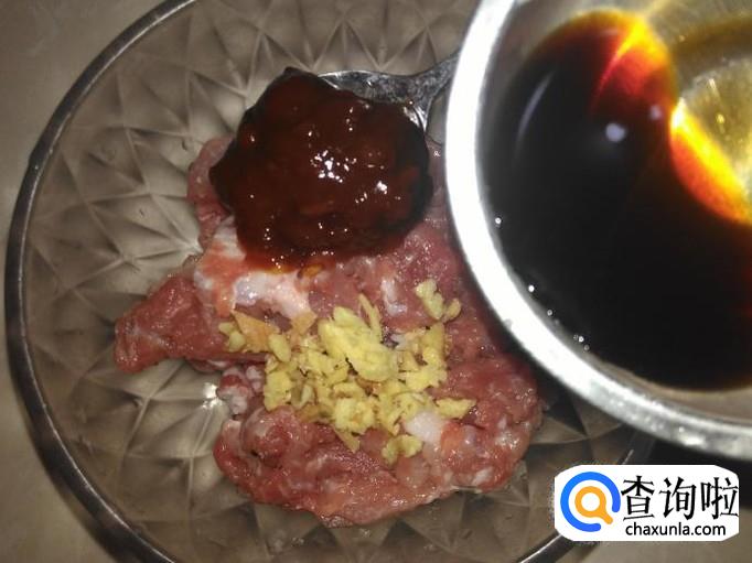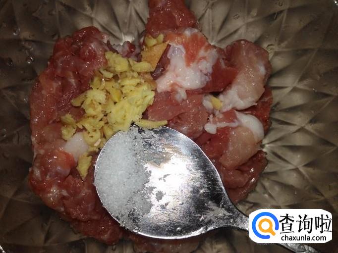 把瘦肉切成片再剁成碎肉,加适量的盐、姜蓉。【瘦肉不要剁得太碎】