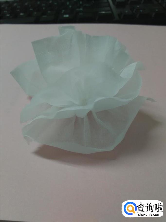 用同样的方法,把左边的第一层和第二层的纸也立起来,一朵洁白漂亮的花就做完了,还可以用其他颜色的纸折叠,如果用普通的纸,最好要用三个同样大小的正方面形纸叠在一起来做纸花。