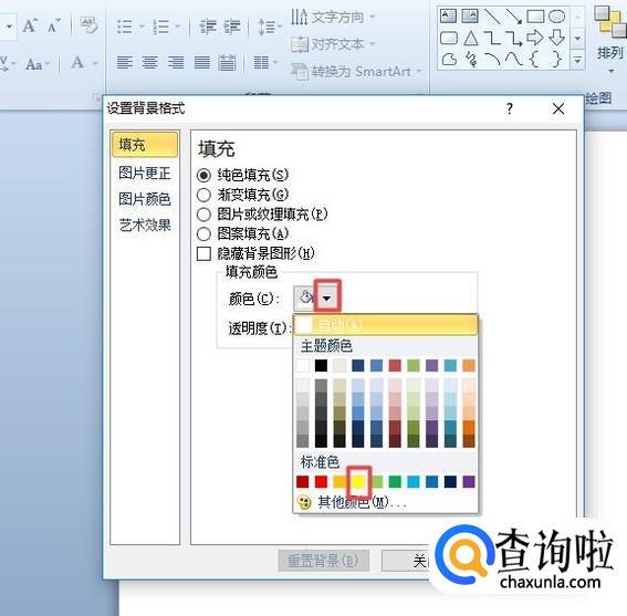 弹出的界面,我们点击填充颜色边上的下拉箭头,弹出的界面,我们点击选中黄色;