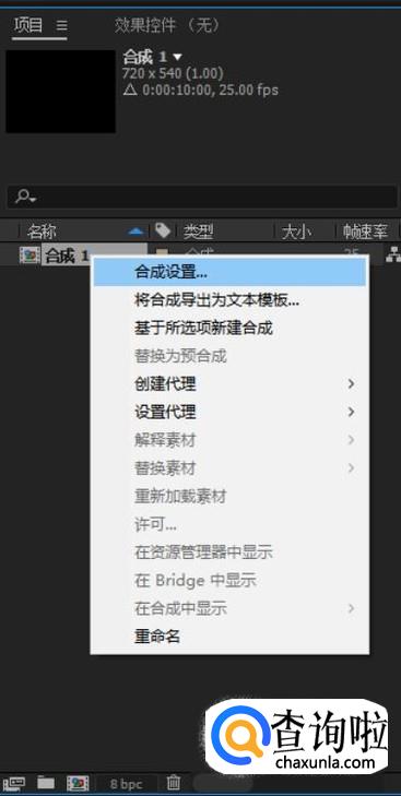 当我们新建好一个合成,如何再去修改时间参数呢,我们在项目面板右键单击合成,选择合成设置,如图。