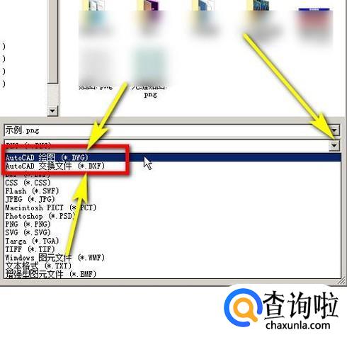 弹出导出对话框,鼠标点保存类型下拉按钮,在弹出的各种保存类型是,选择:DWG;或是DXF;再保存即可。如图所示。