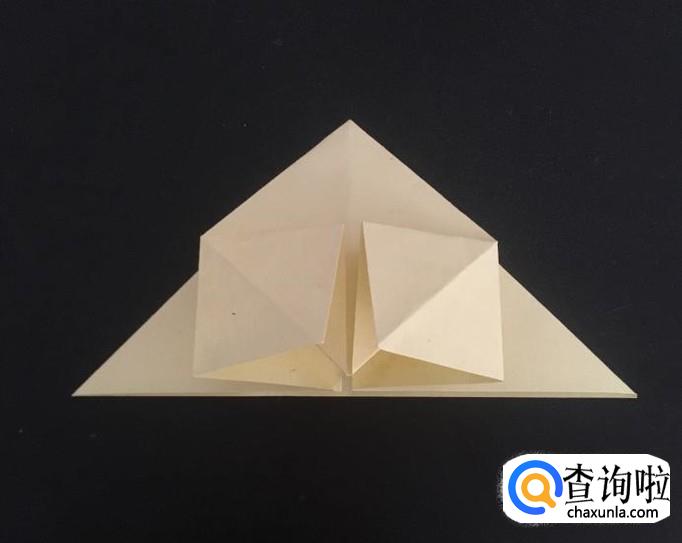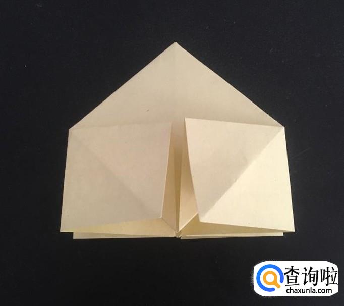 打开右侧的角并向下折出一个小正方形,左侧也折出一个小正方形。