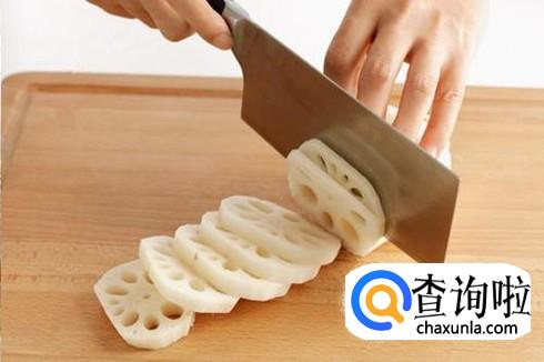 先把莲藕打皮,再切成夹片 就是先切稍厚的一片,再用刀分成二片,但不要到底,用来夹猪肉馅 。再把藕片放在水里面泡一下拿出来控干水分。切藕片要要特别细心,不要切到底,也不要切太薄,要不很容易切碎了。