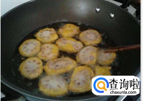 锅烧热放稍稍多一点花生油,油热后把藕盒子放下去炸,炸成金黄色后捞出来控油即可食用。