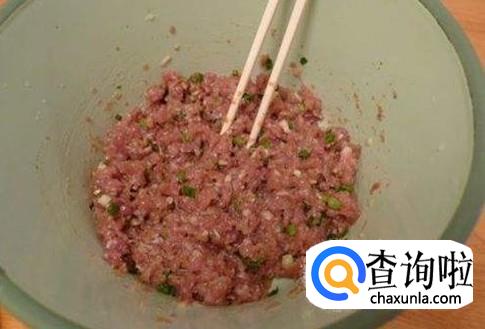 再把猪肉剁成肉泥,放生粉,蚝油,鸡粉,五香粉,盐搅拌均匀腌五到十分钟。