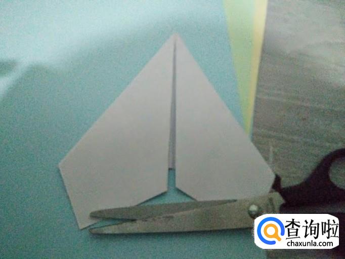 下面开始裁剪。把折好的纸张角的部分朝向自己,重叠开口处向右,然后在右下部剪一个小缺口,如图