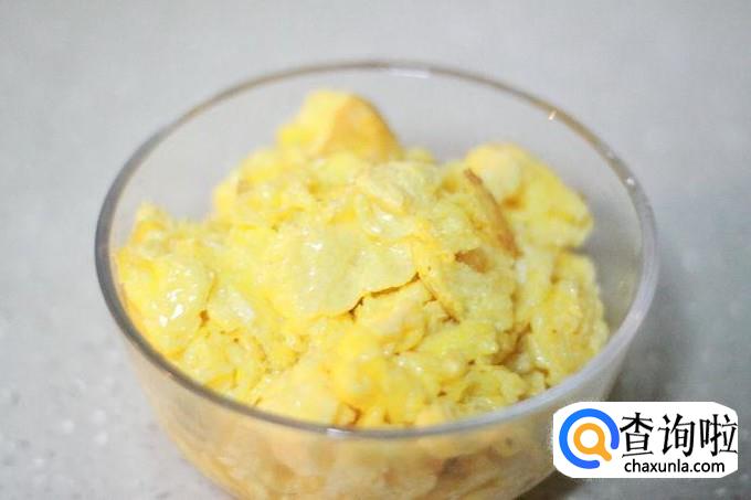 然后香菇用清洗洗净切成块、鸡蛋用油炒熟把鸡蛋可以尽可能的炒的碎一些。