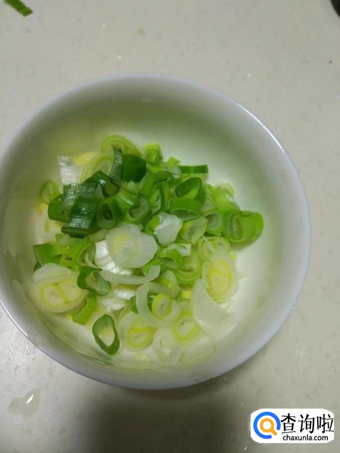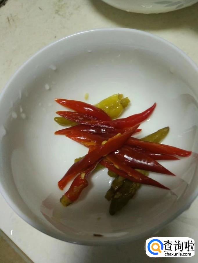 从泡菜坛里捞几个泡椒,然后切丝备用;大葱切碎备用