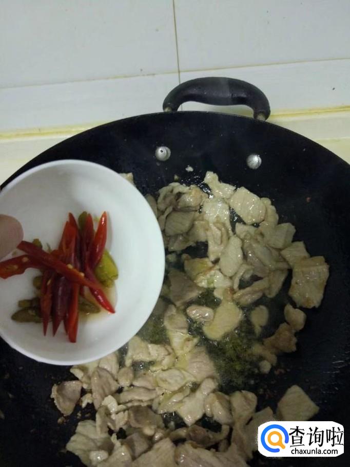 在锅里加入准备好的泡椒,然后进行翻炒