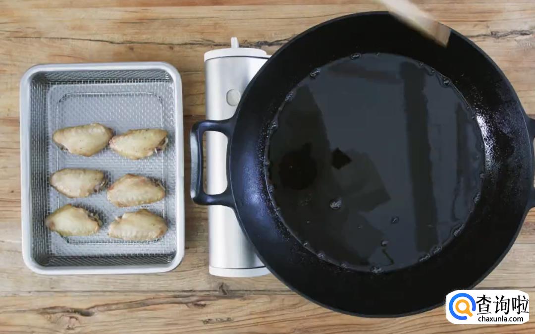 锅里倒入色拉油,加热至160度(筷子插入油底部,油泡从筷子底部缓缓上升时就是160度),加入鸡翅,保持油温,慢慢炸七八分钟捞出来滤油,放3分钟左右。