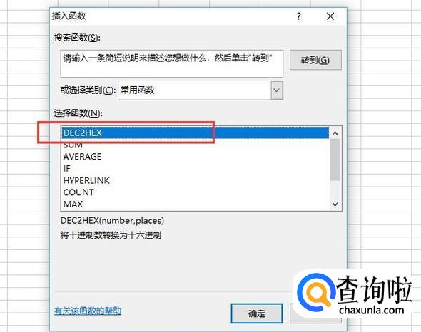 然后在弹出的界面中找到DEC2HEX函数,这个是专门进行十进制转化为十六进制的函数