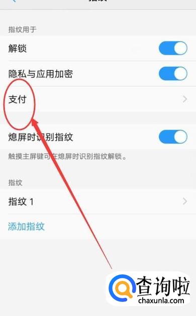 进入指纹选项之后,点击“支付”,进入指纹支付设置页面,如图所示。
