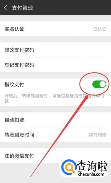 点击“微信”之后,我们可以直接进入到微信的支付管理页面,将指纹支付右侧的小滑块向右拖动即可将指纹支付设置完成,如图所示。