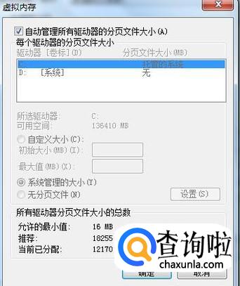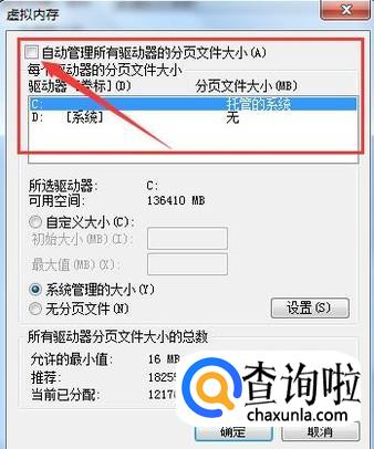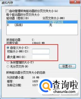 钩去掉后在下方会看到自定义大小的功能点击它即可,这个功能就更改虚拟内存的功能,如图