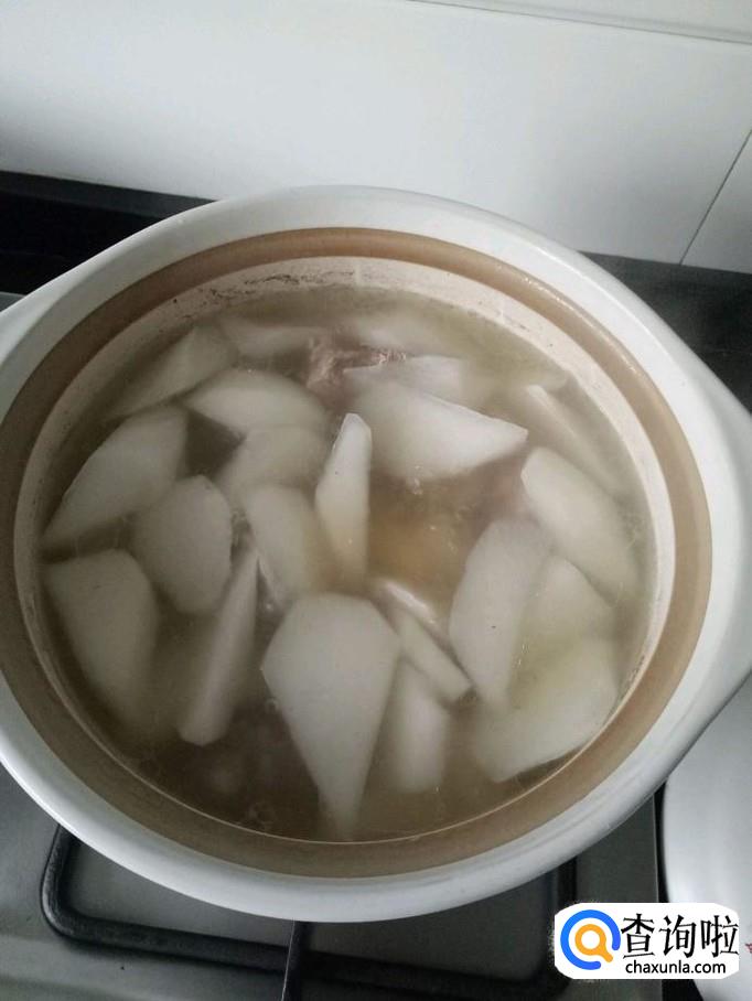 然后在我们可以在砂锅里面加入葱姜蒜,依次把猪大骨和萝卜块放入砂锅里面煮,先大火烧开然后转小火慢炖。