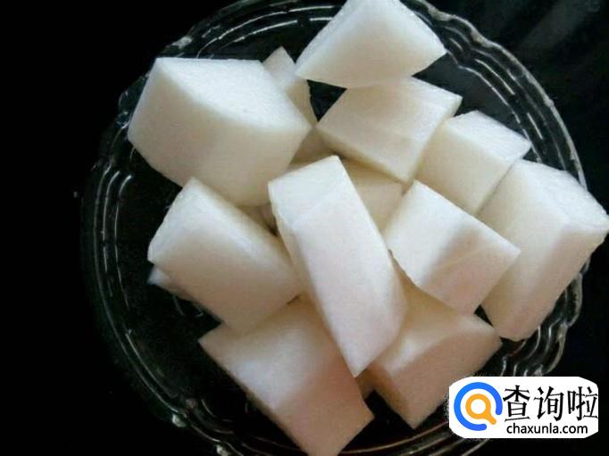 我们就要把白萝卜削皮洗净切块,我们可以划斜刀,切成大小相似的萝卜块备用。