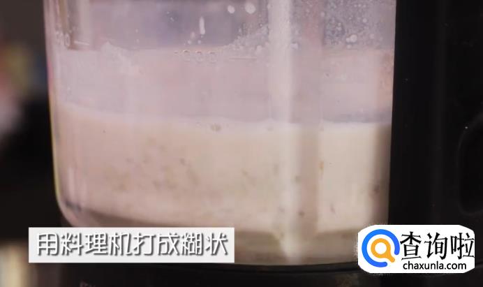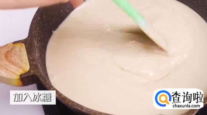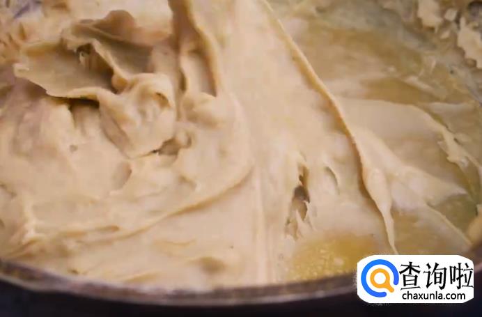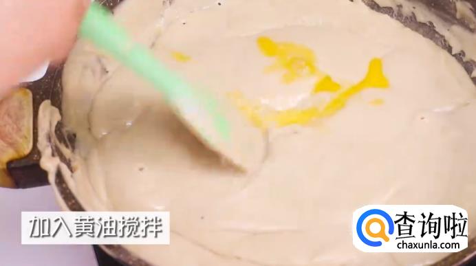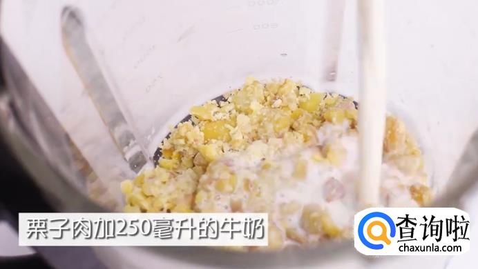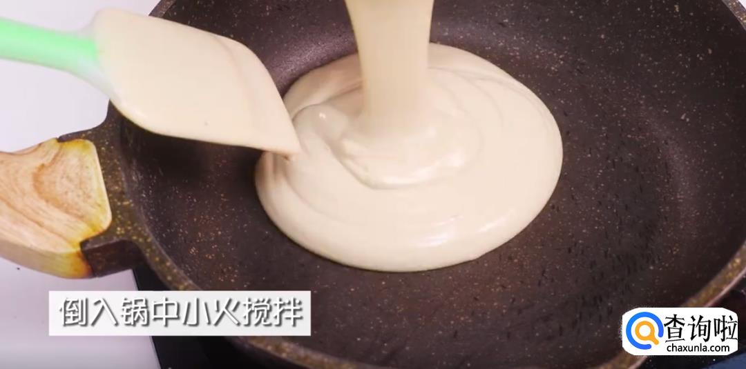 将打好的栗子牛奶糊倒入不粘锅中用小火搅拌。