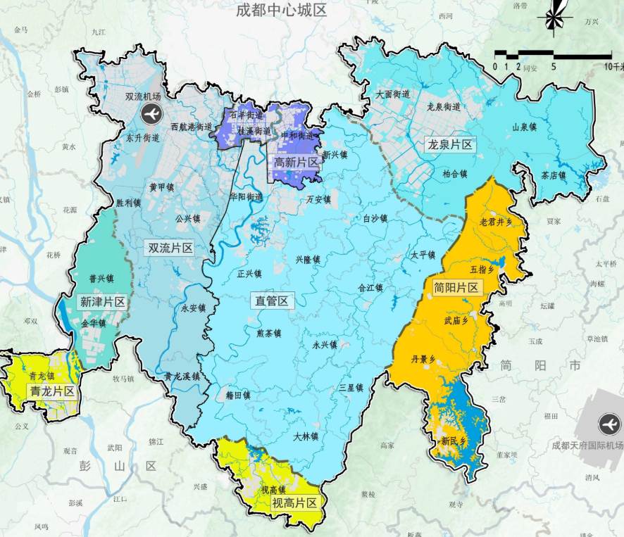 规划范围:为加快四川天府新区建设,经由成都市人民政府批准,自2013年12月1日起,万安镇、兴隆镇、新兴镇、白沙镇、太平镇、煎茶镇、永兴镇、合江镇、籍田镇、大林镇、三星镇和剑南大道南段(元华路)以东的华阳街道、正兴镇范围内的社会管理、公共服务等事务,由四川天府新区成都片区管理委员会管理和服务。成都天府新区直管区面积564平方公里,占四川天府新区总规划面积的35.74%。