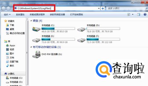 日志文件的路径C:WindowsSystem32LogFilesWMI,这个文件夹如果没有管理员权限,宽带连接也会有问题,出现651或711等错误提示的。首先双击计算机,进入计算机文件夹,在地址栏输入C:WindowsSystem32LogFiles后回车。