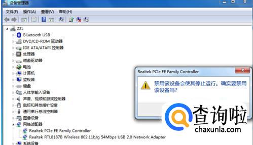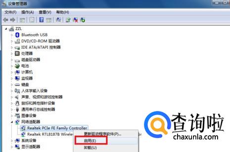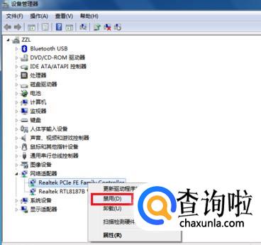 在设备管理器页面找到“网络适配器”,下面一般有两个网卡,一个有线一个无线网卡。右键点击【有线网卡】,在弹出的菜单中选择【禁用】,出现提示框点击【确定】,然后再右键【启动】,看看重新拨号是否正常。