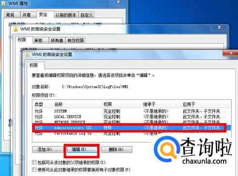 在WMI文件夹高级页面,选中你目前使用的账户,然后点击【编辑】按钮。