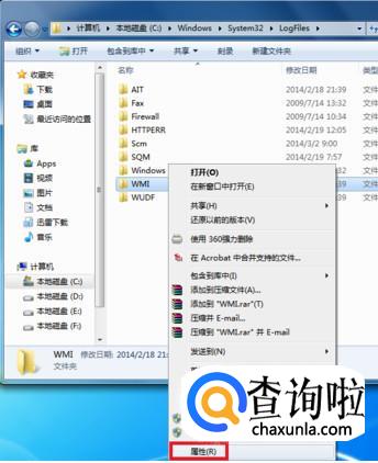 在LOgFiles文件夹下找到WMI文件夹,然后选中点击右键,在弹出的菜单中选择【属性】,其实就是让它获得永久管理员权限,这种方法可以不用每次重启电脑后都要修改一次权限。