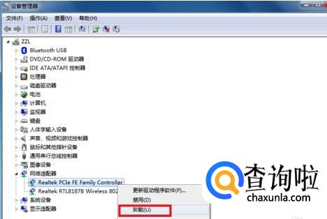 如果不正常的话,用鼠标右键点击有线网卡,在弹出的菜单中选择【卸载】,将网卡驱动卸载掉。