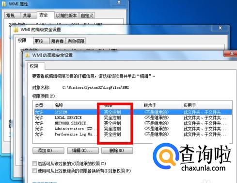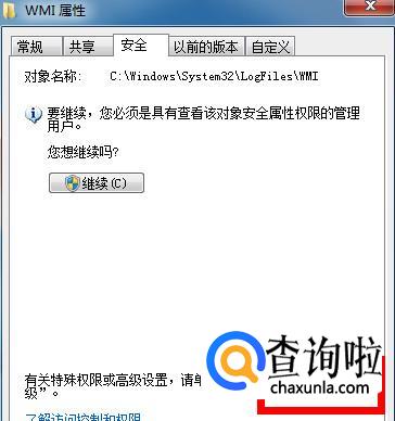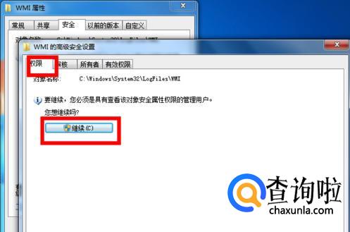 然后,在WMI文件夹高级属性页面,选择【权限】,并在页面上点击【继续】。